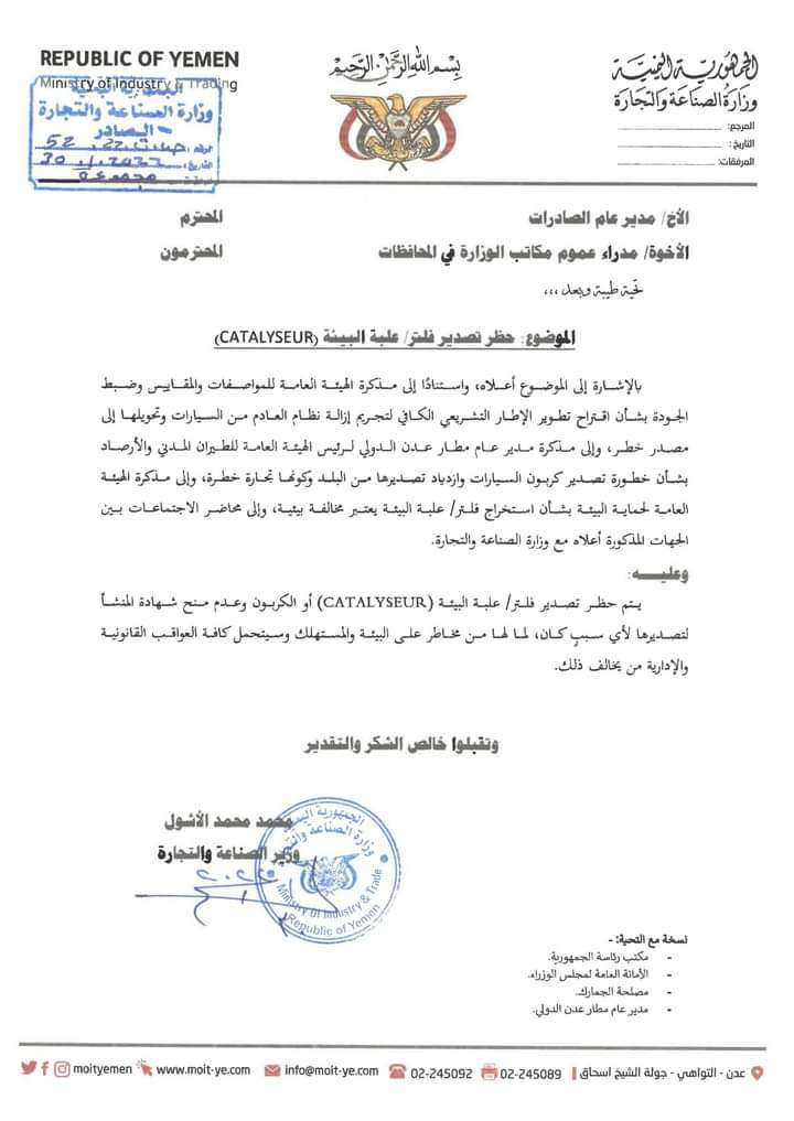 وجه وزير الصناعة والتجارة محمد محمد حزام الاشول تعميما هاما بحظر تصدير فلتر علبة البيئة (الكتالايزر ) لما لها من مخاطر على البيئة والمستهلك .