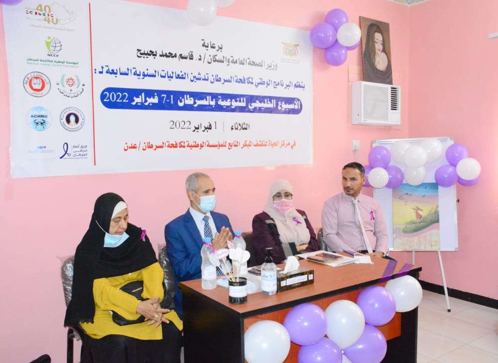 دشن البرنامج الوطني لمكافحة السرطان بوزارة الصحة العامة والسكان، في العاصمة المؤقتة عدن، اليوم، فعاليات الأسبوع الخليجي السابع للتوعية بمرض السرطان للفترة من 1 حتى 7 فبراير الجاري، وذلك انطلاقا من مركز الحياة للكشف المبكر التابع للمؤسسة الوطنية لمكافحة السرطان في عدن.