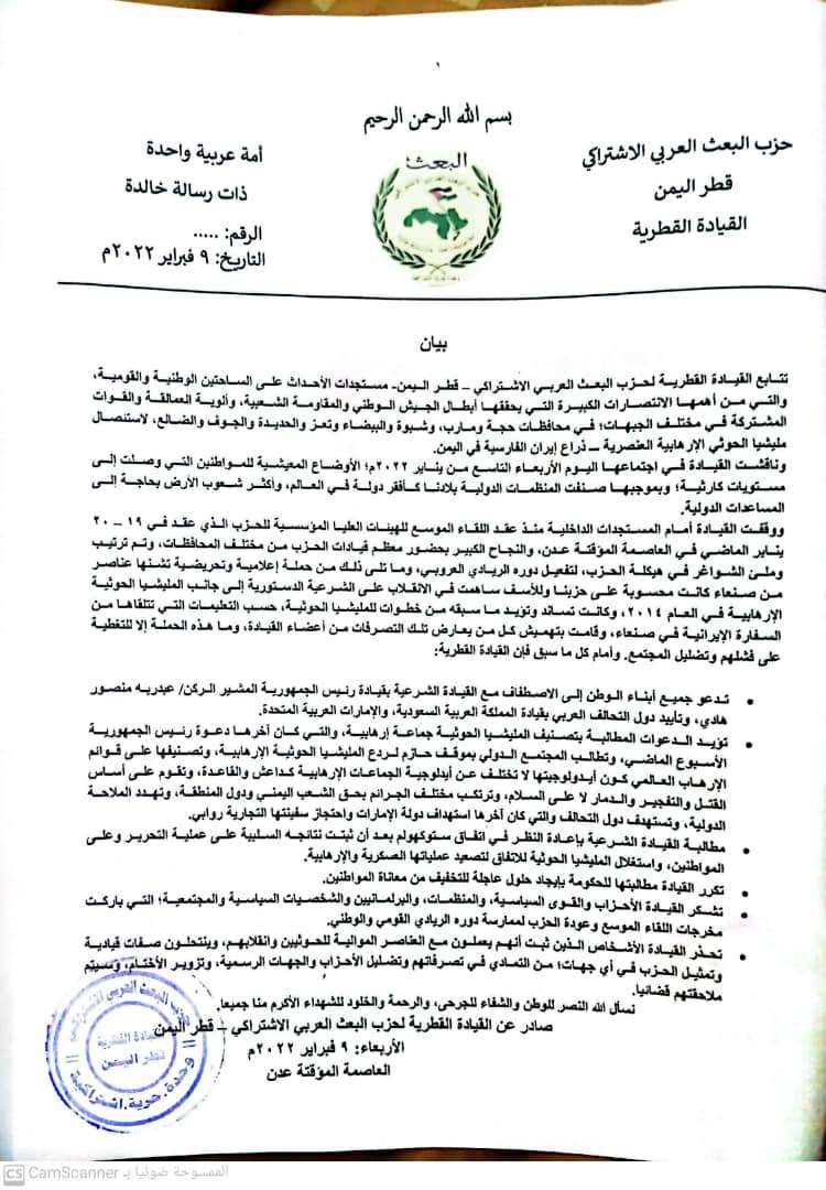 قيادة القطرية لحزب البعث العربي الإشتراكي – قطر اليمن- لمستجدات الأحداث على الساحتين الوطنية والقومية، والتي من أهمها الإنتصارات الكبيرة التي يحققها أبطال الجيش الوطني والمقاومة الشعبية، وألوية العمالقة والقوات المشتركة في مختلف الجبهات؛ في محافظات حجة ومارب، وشبوة والبيضاء وتعز والحديدة والجوف والضالع، لاستئصال مليشيا الحوثي الإرهابية العنصرية ـــ ذراع إيران الفارسية في اليمن.