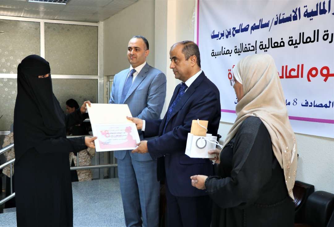 كرم وزير المالية سالم بن بريك، اليوم، بالعاصمة المؤقتة عدن، موظفات الوزارة بمناسبة اليوم العالمي للمرأة الذي يصادف 8 مارس من كل عام.