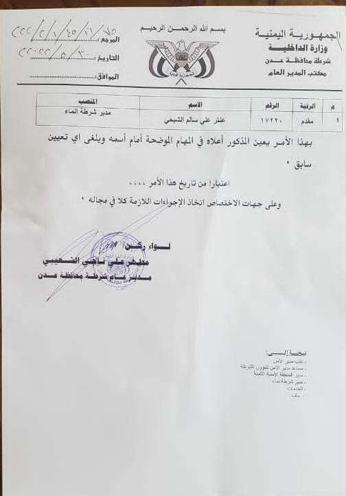 عين مدير أمن العاصمة عدن، اللواء مطهر علي ناجي، اليوم، المقدم عنتر علي سالم الشبحي، مديراً لشرطة إنماء بالعاصمة عدن.