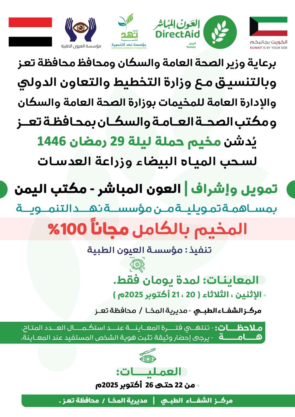 سيقام  بمحافظة تعز في مديرية المخاء فعاليات مخيم حملة "ليلة 29 رمضان 1446هـ" لسحب المياه البيضاء وزراعة العدسات مجانًا بنسبة 100%، وذلك برعاية معالي وزير الصحة العامة والسكان ومحافظ محافظة تعز، وبالتنسيق مع وزارة التخطيط والتعاون الدولي، والإدارة العامة للمخيمات بوزارة الصحة العامة والسكان، ومكتب الصحة العامة والسكان بالمحافظة.