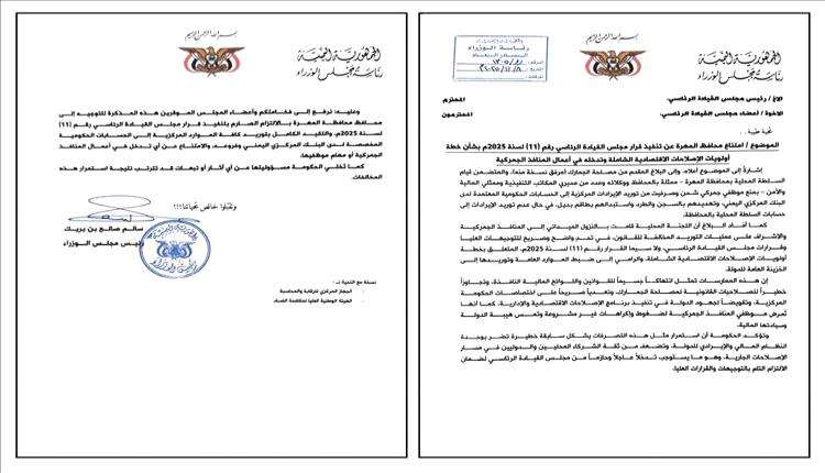 وجّه رئيس مجلس الوزراء وزير المالية، سالم صالح بن بريك، مذكرة رسمية إلى مجلس القيادة الرئاسي، طالب فيها بتدخل عاجل وحاسم لإلزام محافظ محافظة المهرة بتنفيذ قرار المجلس رقم (11) لسنة 2025، القاضي بتوحيد الإيرادات العامة وتوريدها إلى البنك المركزي اليمني في العاصمة المؤقتة عدن وفروعه، وعدم التدخل في أعمال المنافذ الجمركية أو مهام موظفيها.