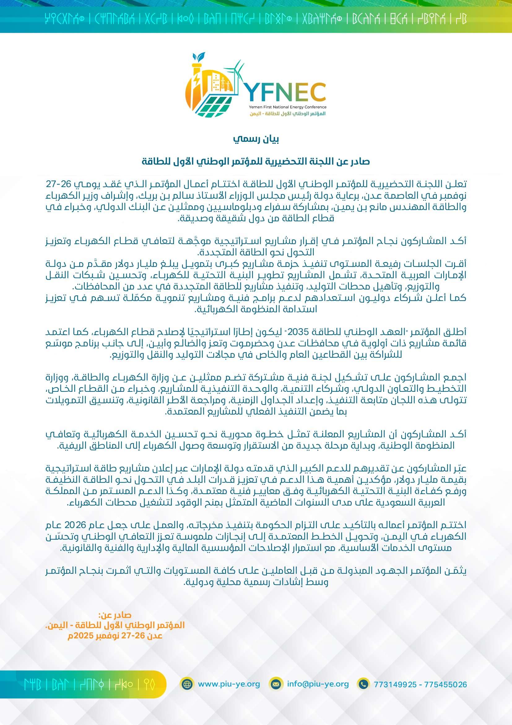تعلن اللجنة التحضيرية للمؤتمر الوطني الأول للطاقة اختتام أعمال المؤتمر الذي عُقد يومي 26-27 نوفمبر في العاصمة عدن، برعاية دولة رئيس مجلس الوزراء الأستاذ سالم بن بريك، وإشراف وزير الكهرباء والطاقة المهندس مانع بن يمين، بمشاركة سفراء ودبلوماسيين وممثلين عن البنك الدولي، وخبراء في قطاع الطاقة من دول شقيقة وصديقة.