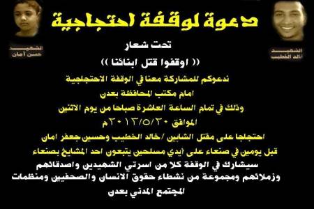 دعوة لوقفة احتجاجية الاثنين القادم امام محافظة عدن للتنديد بمقتل امان والخطيب بتاريخ 2013-05-18 الساعة 16:26 خليج عدن دعوة لوقفة احتجاجية الاثنين القادم امام محافظة عدن للتنديد بمقتل امان والخطيب