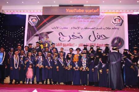 نظم طلاب قسم الصحافة والاعلام بكلية الآداب جامعة عدن أمس بقاعة سبأ بمديرية خور مكسر حفل تخرج الدفعة (13) دفعة (إعلاميو الغد) لطلاب قسم الصحافة والإعلام المتخرجين من الكلية للعام الجامعي 2013/2014م والبالغ عددهم (80) طالباً وطالبة في تخصصات الصحافة والإذاعة والتلفزيون والعلاقات العامة.