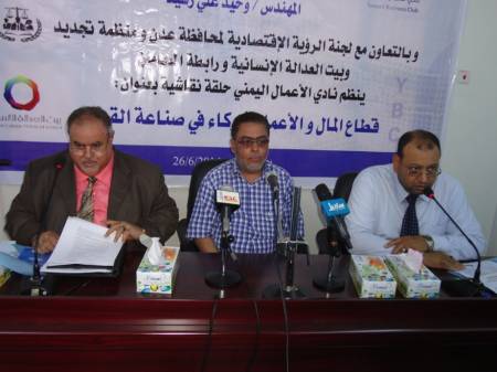 نظم نادي الأعمال اليمني اليوم في عدن بالتعاون مع لجنة الرؤية الاقتصادية لمحافظة عدن ومنظمة تجديد ورابطة المحامين وبيت العدالة ورعاية الأخ المهندس وحيد علي رشيد محافظ محافظة عدن حلقة نقاشية بعنوان قطاع المال والأعمال شركاء في صناعة القرار.