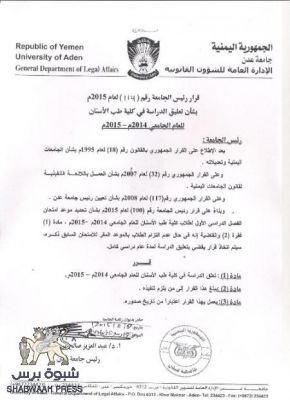 أصدر أ.د. عبد العزيز حبتور رئيس جامعة عدن قرار بشأن تعليق الدراسة في كلية طب الأسنان للعام الجامعي 2014م-2015م .