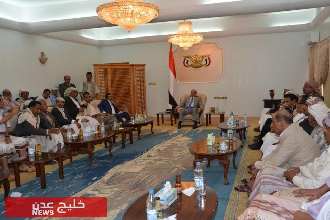 التقى الأخ الرئيس عبدربه منصور هادي رئيس الجمهورية بالعاصمة الاقتصادية والتجارية عدن اليوم أعضاء السلطة المحلية والتنفيذية والمشايخ والأعيان والشخصيات الاجتماعية في إقليم سبأ الذين قدموا التهنئة للأخ الرئيس بسلامة خروجه من العاصمة صنعاء ووصوله إلى عدن .