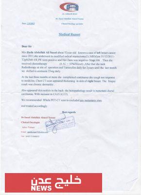 ناشدت أسره من عدن المجتمع الدولي بإجلائنا للسفر للعلاج بالخارج حيث إننا نعاني من مرض خبيث و يتوجب علينا للسفر للخارج في اقرب وقت .