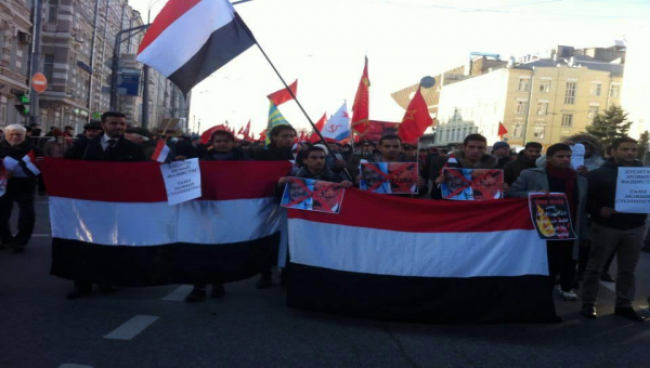 في تظاهرة هي الأولى من نوعها وتحت شعار "الحوثيون الفاشيون الجدد.. تعز ستالين جراد".. نظم اليمنيون المقيمون في العاصمة الروسية موسكو، أمس السبت، تظاهرة تأييداً للشرعية ورفضاً للانقلاب الحوثي وآلة القتل والجرائم بحق الإنسانية في عموم المدن اليمنية وتعز علی وجه الخصوص.