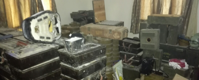 وتوضح صور المعمل بعد اقتحامه فجرا وجود كميات هائلة من المتفجرات والهواتف التي تستخدم في التفجيرات والشرائح اﻻلكترونية واﻻقنعة بالإضافة الى سيارة مفخخة.