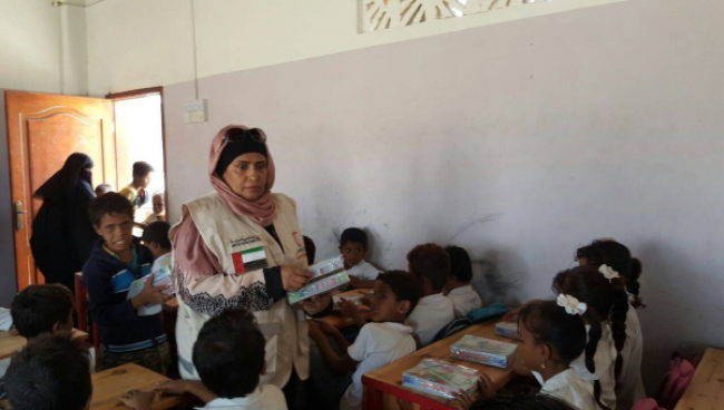 وأوضحت الدكتورة إشراق السباعي – منسقة الهلال الأحمر الإماراتي ، أن الهلال الأحمر الإماراتي قام وفي إطار تنفيذ مشروع توزيع الحقائب والكراسات المدرسية ، بتوزيع 540 كراسة و100 حقيبة مدرسية في مديرية البريقة منطقة عمران .